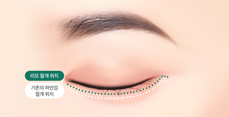 리모는 아래 속눈썹에 최대한 근접해 절개선을 디자인하고 속눈썹을 보존하여 흉터가 노출되지 않도록 합니다