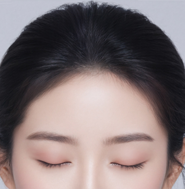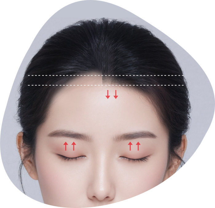 넓은 이마는 줄이고 눈썹과 눈가를 끌어올려 어리고 밝은 인상으로의 변화를 목표로 합니다
